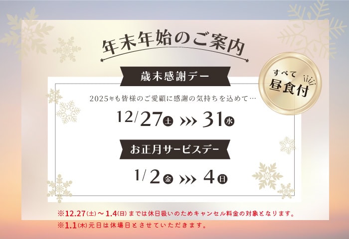 2025年12月27日(土)~2026年1月4日(日)の期間はキャンセル料金の対象となりますので予めご了承ください。