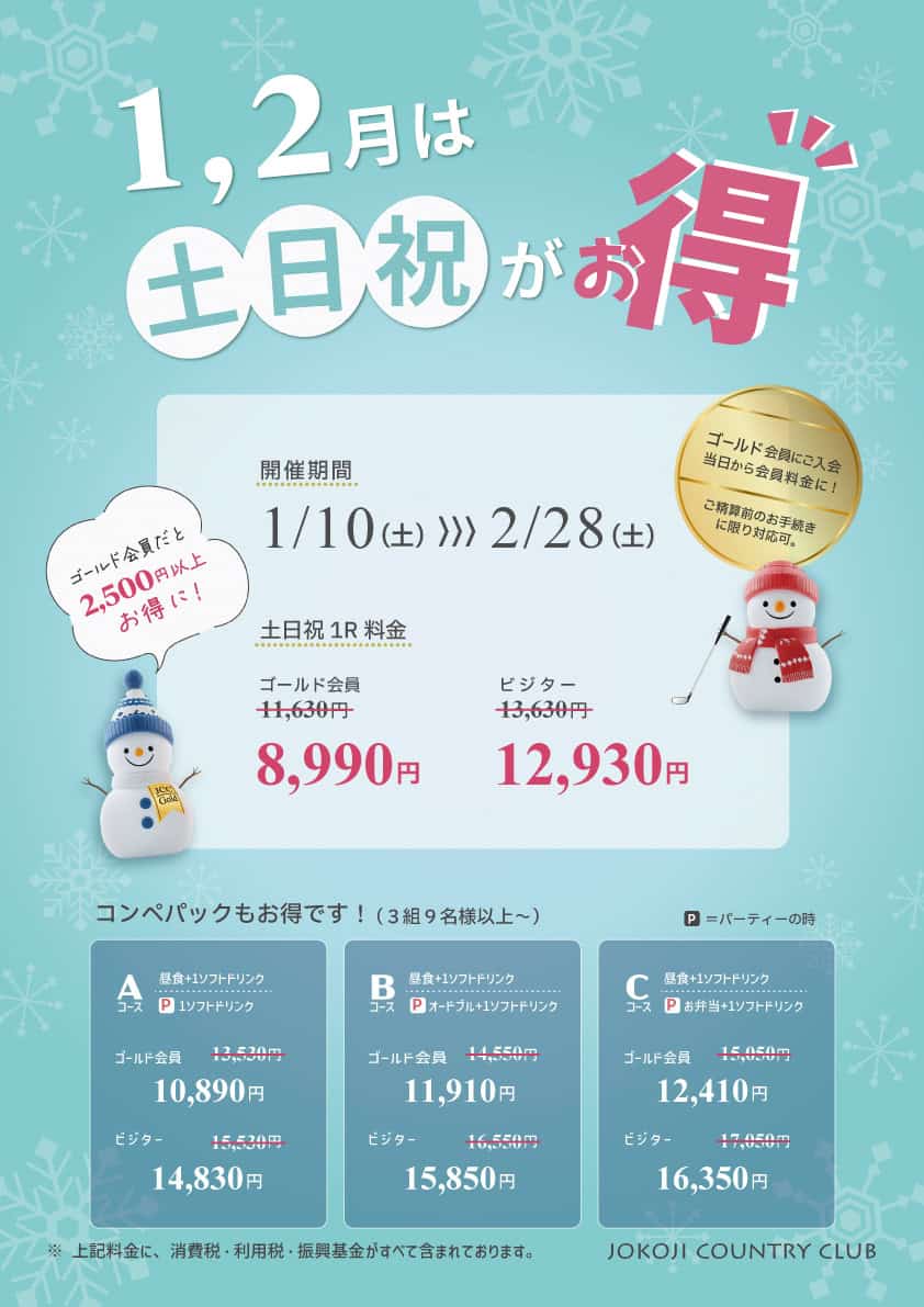お知らせ 1,2月は土日祝がお得! 2025.10.14 お知らせ ゴールド会員様もビジター様もお得に楽しめる1・2月の期間限定、土日祝日の特別プランです🌟お得に楽しく運動できる!健康づくりにもピッタリの季節にぜひ定光寺CCでゴルフをお楽しみください! あっちむいて ”ホイッ” チャレンジ!前の記事 11月3日(祝月)「夕刻・ナイタークローズのお知らせ」次の記事 関連記事 競技入賞者の皆様への電話連絡終了のお知らせ 2025.05.26 ホームページをリニューアルしました 2025.01.23 GWがさらにお得に! 2025.04.21 電話番号のお掛け間違いにご注意ください 2025.05.21 夏の土日お得料金!のご案内 2025.05.06 11月もお得に!「祝日サービスデー」 2025.09.18