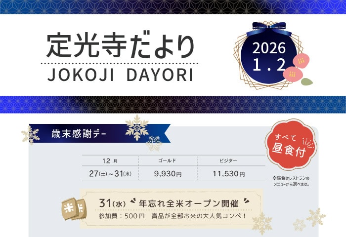 お知らせ , 定光寺だより 定光寺だより1・2月号 2025.12.01 お知らせ , 定光寺だより 1・2月の年始のご案内やお得情報、レストランからのおいしいお知らせなど今回も耳より情報満載です!↓ぜひクリックしてご覧ください↓ 定光寺だより1・2月号 ナイターファイナルキャンペーン開催!前の記事 崖崩落で通行止めの愛岐道路について次の記事 関連記事 サイコロチャレンジ! 2025.11.01 電話番号のお掛け間違いにご注意ください 2025.05.21 第45回 開場記念競技のご案内 2025.05.05 11月もお得に!「祝日サービスデー」 2025.09.18 もっとお得!特別割引 Days! 2025.07.24 10、12月はファン ”スペシャル” 感謝デー! 2025.08.21