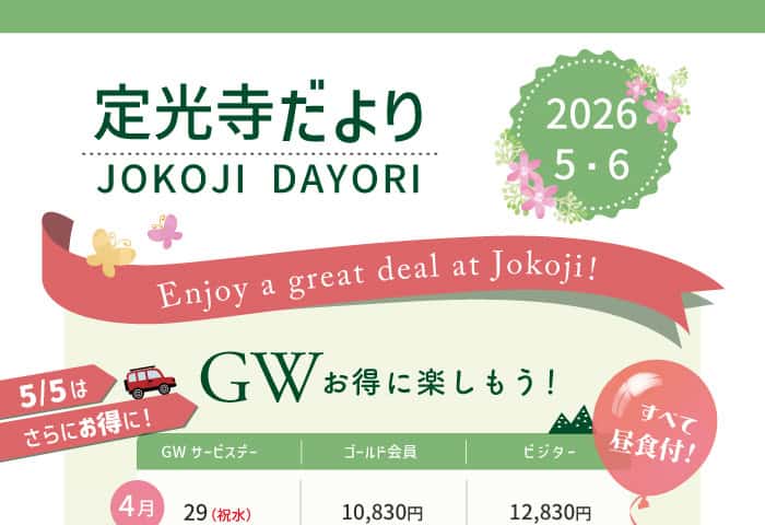 お知らせ 定光寺だより5・6月号 2026.03.31 お知らせ ゴールデンウィークのさらにお得なご案内やお得情報、レストランからのおいしいお知らせなど今回も耳より情報満載です!↓ぜひクリックしてご覧ください↓ 定光寺だより5・6月号 "月末・月初 Smile Day" が始まります!前の記事 もっとお得!ゴールデンウィークのお知らせ次の記事 関連記事 「JCC公式インスタグラム」フォローキャンペーン! 2026.03.04 2026ナイターLED照明リニューアルオープン! 2026.02.23 11月3日(祝月)「夕刻・ナイタークローズのお知らせ」 2025.10.16 電話番号のお掛け間違いにご注意ください 2025.05.21 コース開発工事に関するお知らせ 2026.01.19 【会員限定】JCC公式アプリ登録のご案内 2025.01.06