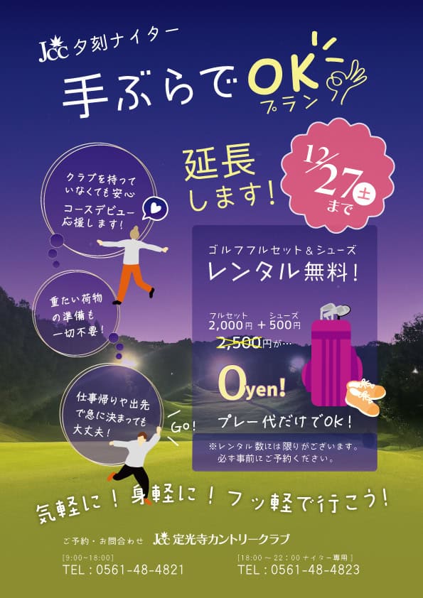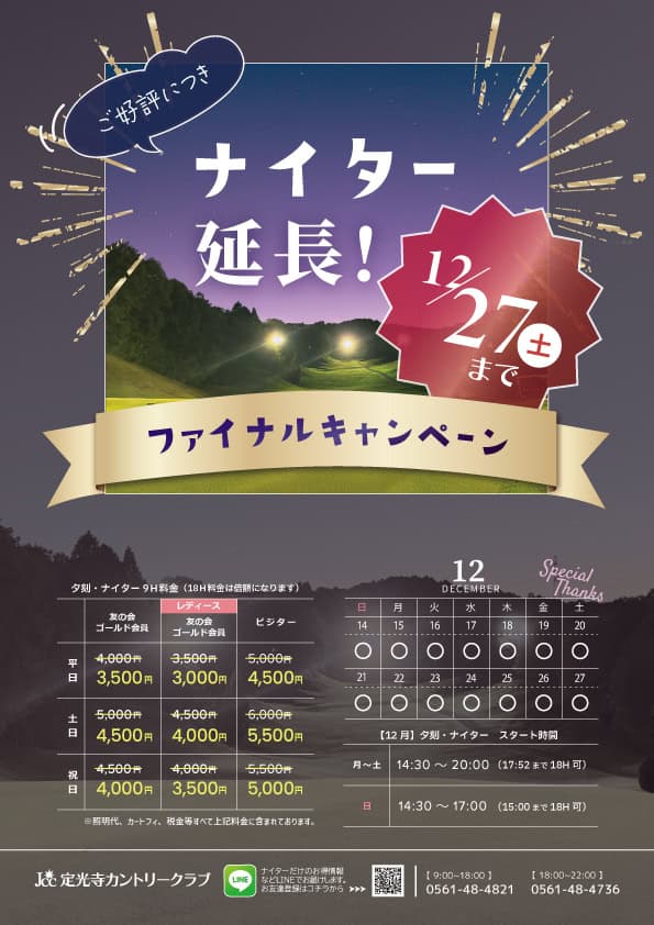 お客様からのご好評の声にお応えして、ナイター営業を 12月27日(土)まで延長いたします。そして、皆様のご愛顧に感謝の気持ちを込めて ”ナイターファイナルキャンペーン” も継続します!さらに、 ”夕刻ナイター「手ぶらでOK!プラン」” もナイターラストまで延長決定です!